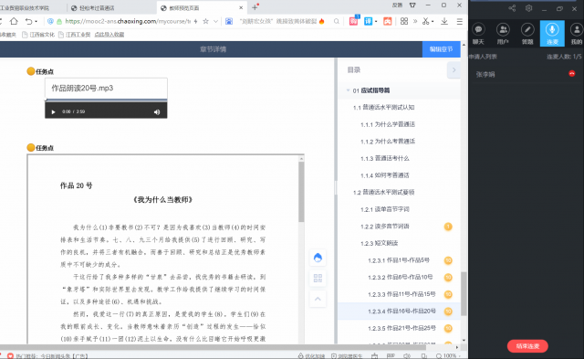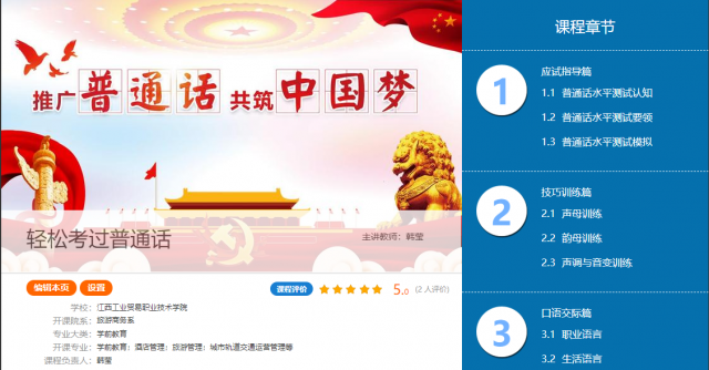 为满足全院师生提高普通话水平的需求,学院普通话水平测试站正牵头积极建设《轻松考过普通话》网络课程,目前面向2022年上半年考证的考生进行推广运行,加下来将继续完善课程资源建设,为广大师生服务。