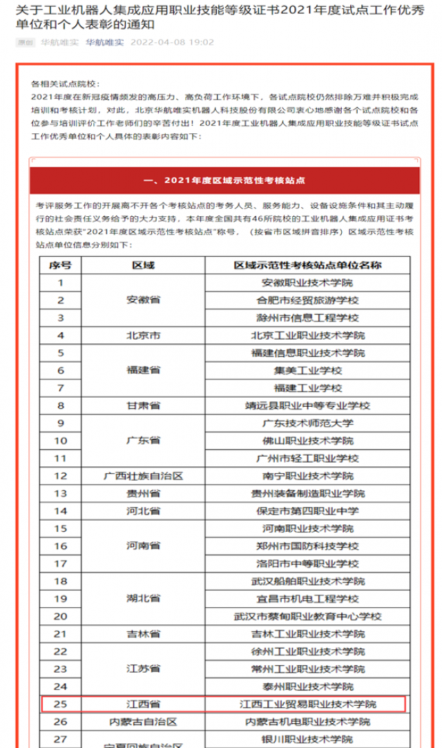 为贯彻落实国务院《国家职业教育改革实施方案》及教育部《关于在院校实施“学历证书+若干职业技能等级证书”制度试点方案》等文件精神,推行“学历证书+职业技能等级证书”制度,鼓励先进、树立典范、总结经验。近日,1+X工业机器人集成应用职业技能等级证书职业教育培训评价组织——北京华航唯实机器人科技股份有限公司(下简称“华航唯实”)印发《关于工业机器人集成应用职业技能等级证书2021年度试点工作优秀单位和个人表彰的通知》,我校的证书考核站点荣获“2021年度区域示范性考核站点”称号。