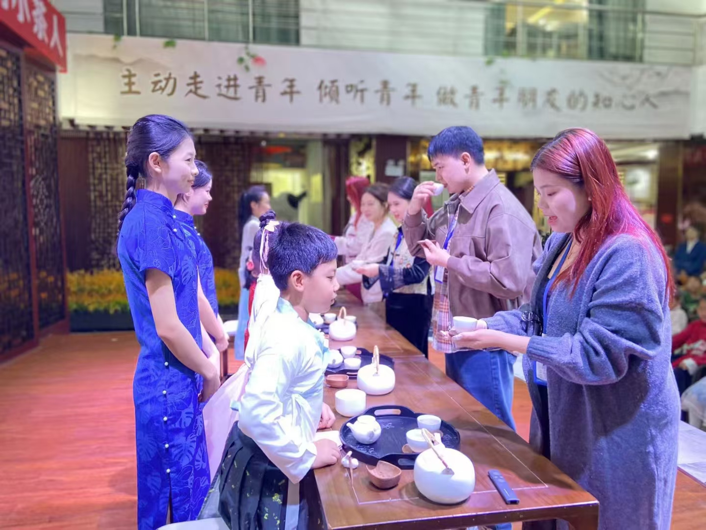 活动现场,小朋友们穿着汉服,他们怀揣着好奇与兴奋踏入这个充满茶香的世界。茶艺师姐姐给小朋友们献上迎客茶,通过学茶礼仪、识茶趣、品茶韵、诵茶诗四个环节,活动不仅让小朋友们学习茶知识、茶礼仪,更为小朋友们打开了一扇通往中华传统茶文化的奇妙大门,让孩子们在做彬彬有礼的小茶人时,也能成为传播中华优秀传统文化的小使者。